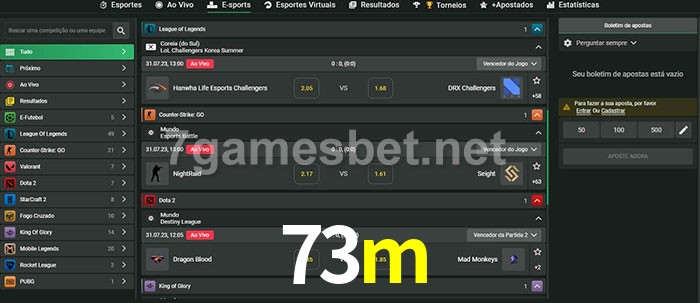 O 73m oferece uma grande seleção de opções de apostas em e-sports com probabilidades competitivas